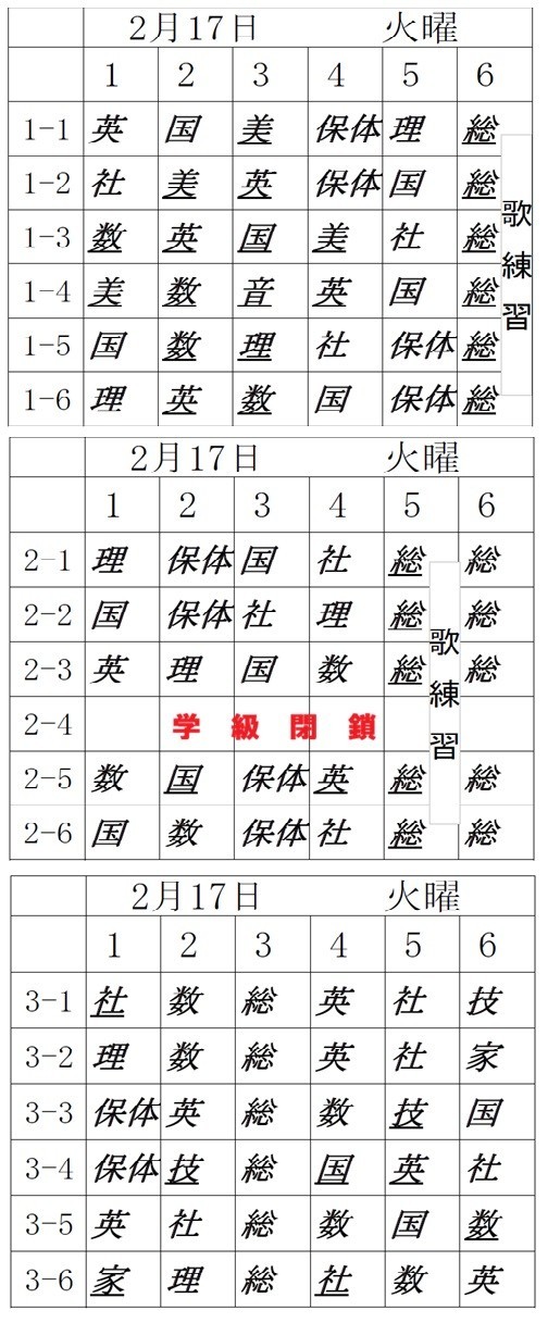 2年4組ではインフルエンザ罹患および発熱による欠席者が多数発生したため、2月18日(水)まで学級閉鎖となりました。インフルエンザはB型が主流のようです。他の学年やクラスの人も、油断せずに、基本的な感染症対策を心がけていきましょう。
