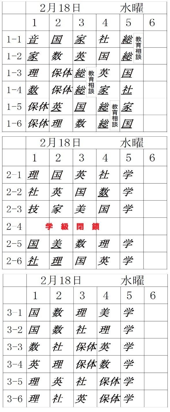 明日は水曜日なので、5時間授業で部活動もありません。また2年4組は、明日まで学級閉鎖の予定です。