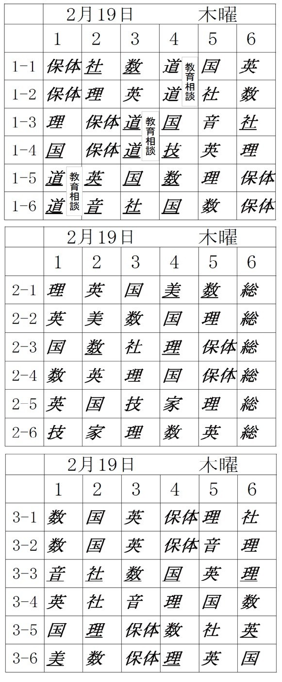 明日2月19日(木)の時間割です。