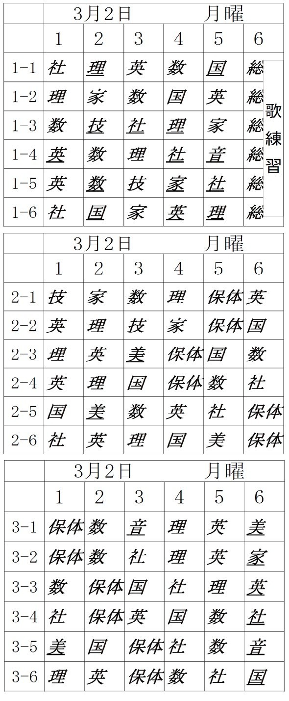 さて来週3月2日(月)の時間割です。