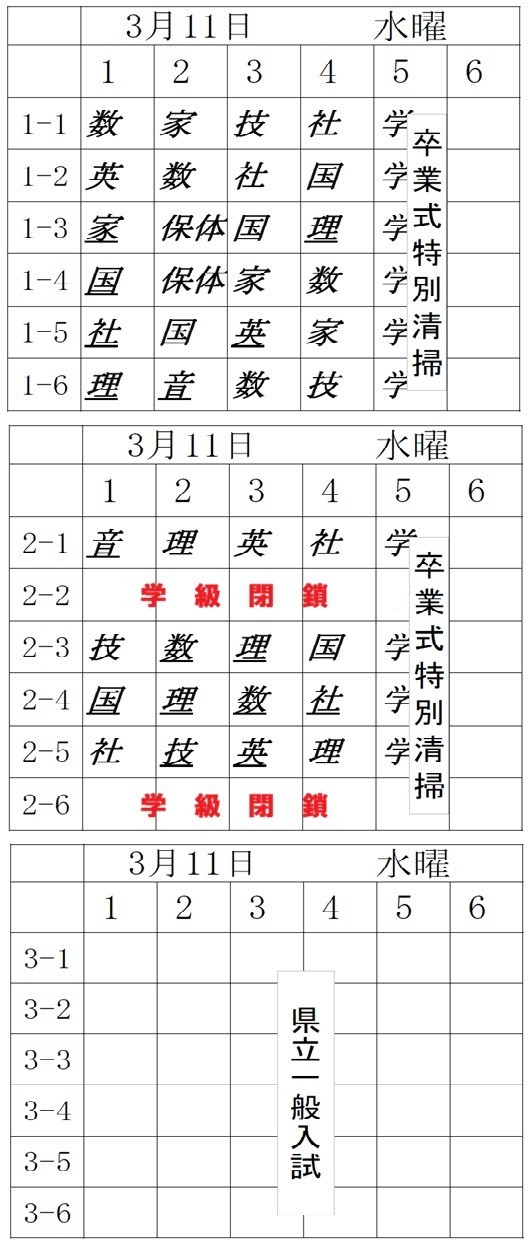3月11日(水)50分×5校時、給食あり、掃除→卒業式特別清掃、部活動なし、帰りの会終了14:20、生徒下校完了14:40(卒業式の係のある人は16:00)です。