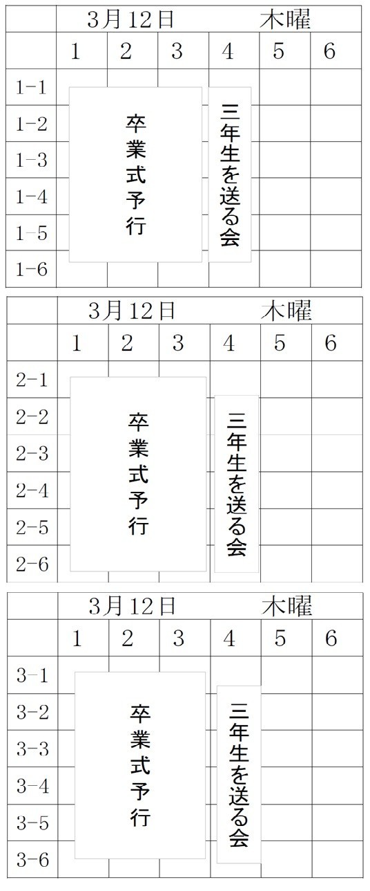 特別時程(卒業式予行+3年生を送る会)、給食なし、掃除なし、部活動なし、帰りの会終了11:40(部活動ミーティングがある場合は12:00頃)、生徒下校完了12:20(卒業式の係の仕事がある人は最長16:30)です。