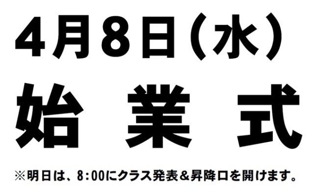 明日は8:00に新しいクラスが生徒昇降口付近に張り出されます。そして生徒昇降口が開くのも8:00です。早く来ても校舎内に入れませんので注意をしてください(明日の朝はとても冷え込む予報です・・・)。