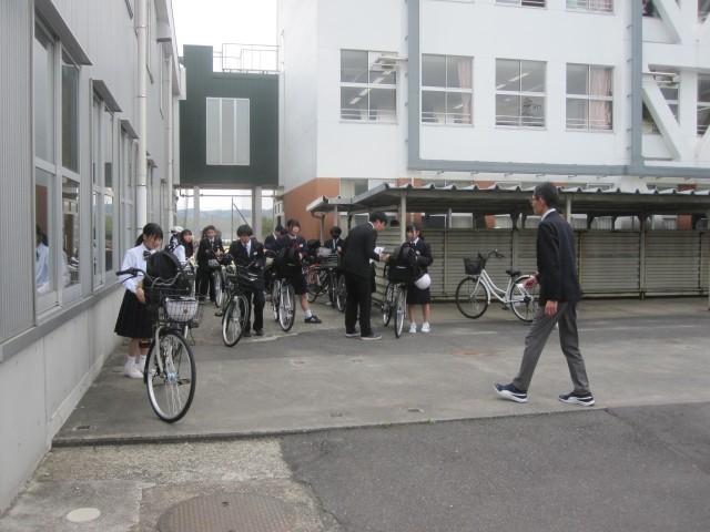 また1年生は、5時間目の時間帯に自転車点検が行われました。自転車通学の生徒が居残り、担任の先生から自転車の整備状況について点検を受けていました。合格の生徒には赤色の「自転車鑑札シール」が配付され、早速自転車の泥よけに貼っていました。