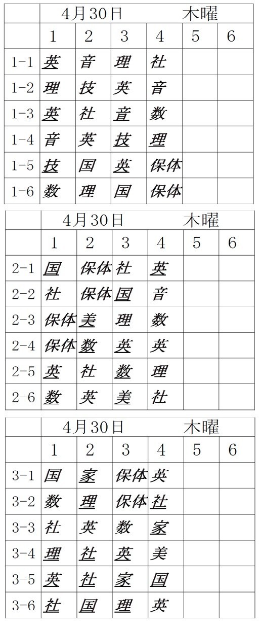 明後日4月30日(木)の時間割です。