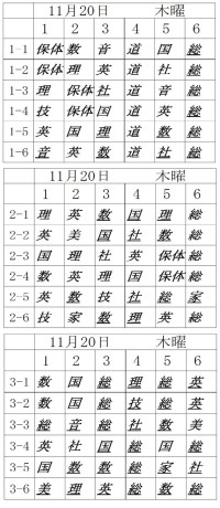 改めて11月17日(月)の時間割です。 50分×6校時、給食あり、掃除あり、部...