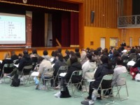 例年は、保護者の皆様を対象に実施していましたが、今回は生徒の皆さんと一緒に同じ話を聞いていただきました。「手続き・スケジュール」の話が多くなりましたが、一番大事なことは、生徒の皆さんの気持ちです。「友達も受けるから」「人がすすめるから」ではなく、時間の許す限り、自らの将来と向き合ってください。不安や迷いがあるのが普通なのです。だからこそ、「知ること」「考えること」を続けて欲しいのです。それぞれの高校の魅力はたくさんあります。「行きたい!」と思う高校を見つけ出してください。保護者の皆様におかれまして、そうした状況のお子様をあたたかく見守ってください。ご不明の点はいつでも学校へご連絡ください。今後ともどうぞよろしくお願いします。
