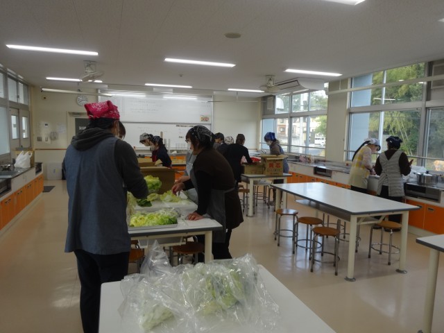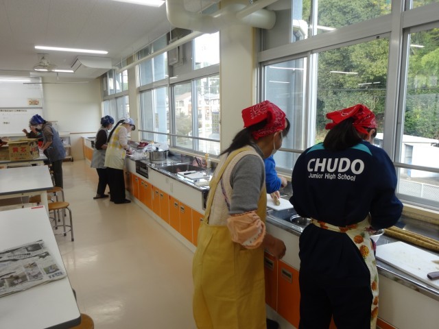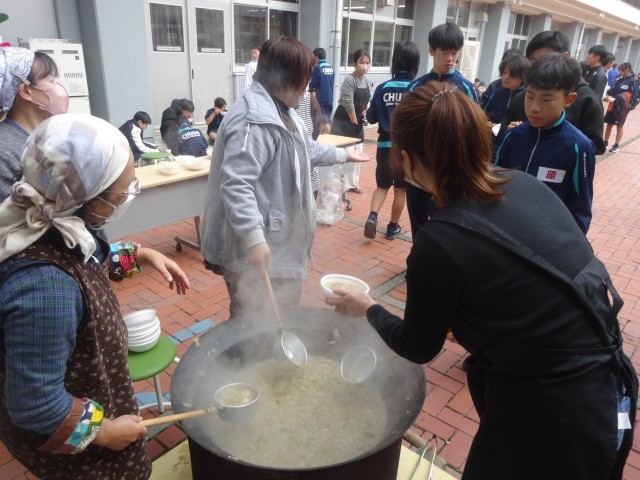 昨年度からクリーン作戦の一環として豚汁を振る舞っています。活動後の「一杯」は格別です。この豚汁は何日も前から相談・準備を重ね、そして、地域食材の提供などのご協力をいただき、更に、多くのボランティアの方々が調理に携わってくださりできたものです。おいしいにきまっています。そのおいしさは、食材の力だけではないはずです。何度もおかわりをする生徒もいました。完食と「おいしかった」の一言が何よりですね。この豚汁を食べた人は期末テストにも力が涌いてくるでしょう。ごちそうさまでした。