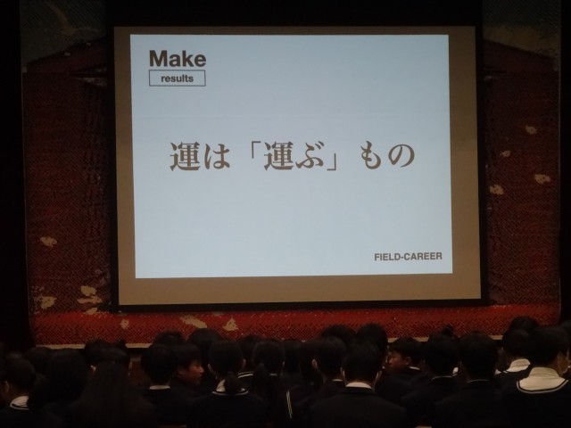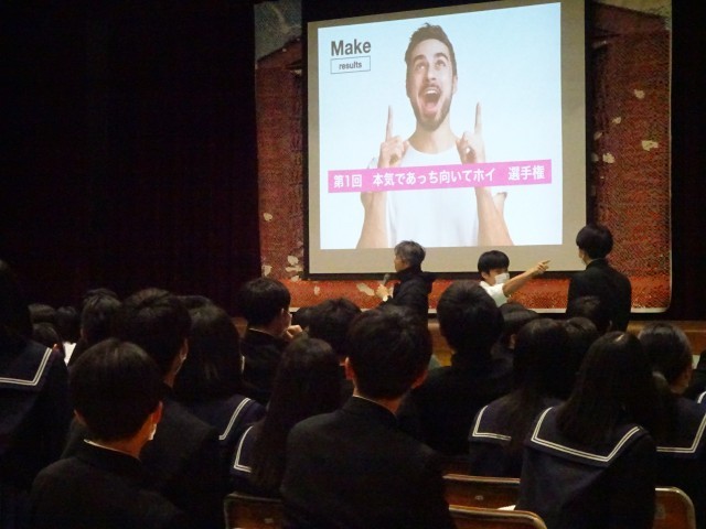 25日(火)にPTAキャリア教育講演会を開催しました。講師は、昨年度にもお世話になった的場亮さんです。熱い思いの魂の言葉に、会場は一瞬の内に的場ワールドに包まれました。90分の時間を感じさせることなく、目を輝かせて話に入る生徒が多く見られました。また、保護者や学校運営協議会の皆様もご参加いただき、目頭を熱くされている姿も拝見しました。