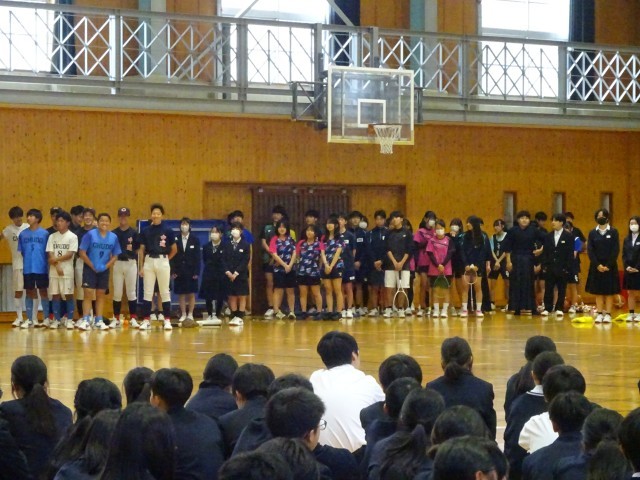 生徒会の企画・運営のもと、実施しました。少しずつ中学校のことを知ってもらうために一生懸命準備をしていました。生徒会からのメッセージや各部の代表が活動を紹介しています。また、先輩達からの校歌のプレゼントもありました。本日から体験入部も始まります。3年間やり遂げるためにしっかり悩んで決めてください。2・3年生の皆さん、ありがとうございました。