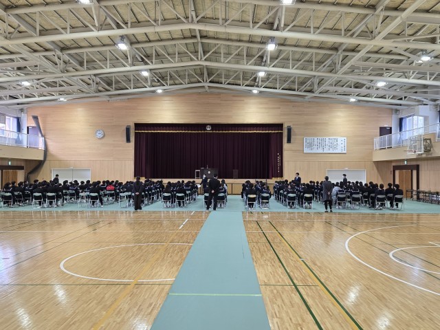 今日は全員で卒業証書を受け取りに出る練習をしました。181人がスムーズに受け取れるように、席を立つタイミングや2人そろってのお辞儀など、手順を確認しながらの練習でした。校歌などの練習もできていました。間もなく卒業です。
