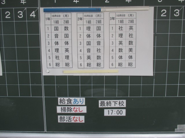 10月6日(月)の時程は、45分の6校時、給食あり、掃除なし、15:10帰りの会が終了、専門委員会後17:00下校完了となっています。(部活はありません。)