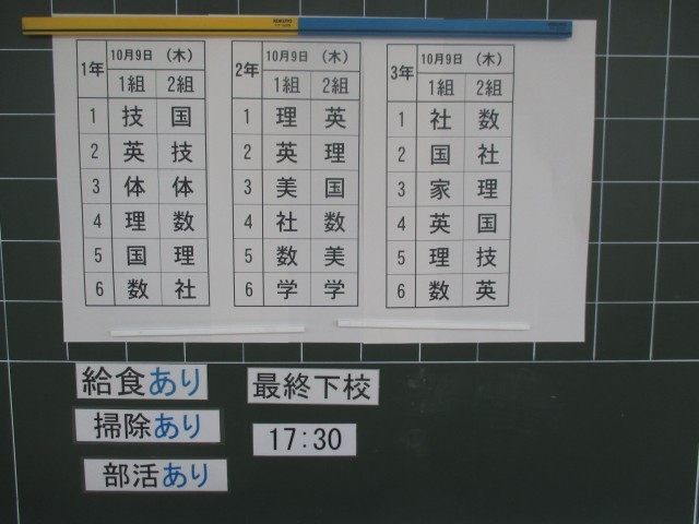 10月9日(木)の時程は50分の6校時、給食あり、掃除あり、15:55帰りの会終了、部活動後17:30下校完了となっています。