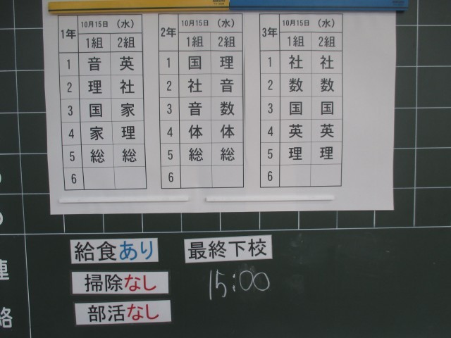 10月15日(水)の時程は50分の5校時、給食あり、掃除なし、14:40帰りの会終了、15:00下校完了となっています。