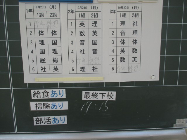 10月20日(月)の時程は50分の6校時、給食あり、掃除あり、15:55帰りの会終了、部活後17:15下校完了となっています。放課後、中央委員会があります。