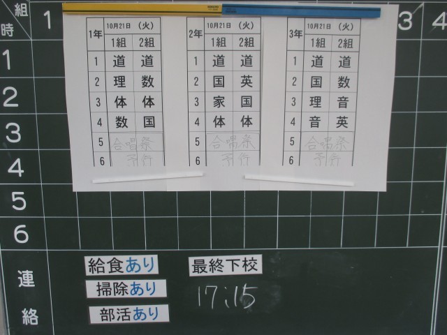 10月21日(火)の時程は、50分の6校時、給食あり、掃除あり、15:55に帰りの会が終了、部活動後17:15に下校完了となっています。