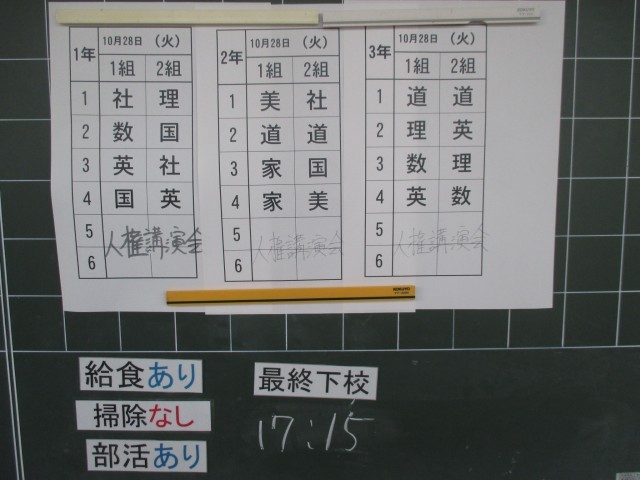 10月28日(火)の時程は、50分の6校時、給食あり、掃除なし、15:55帰りの会終了、部活動後17:15下校完了となっています。