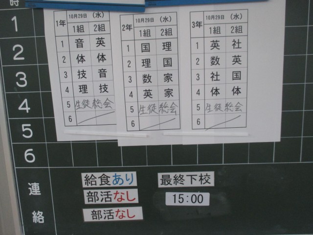 10月29日(水)の時程は50分の5校時、給食あり、掃除なし、14:40帰りの会終了、15:00下校完了となっています。