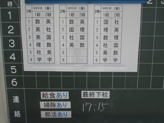 10月31日(金)の時程は 50分の6校時、給食あり、掃除あり、15:55帰りの会終了、部活動後17:15下校完了となっています。