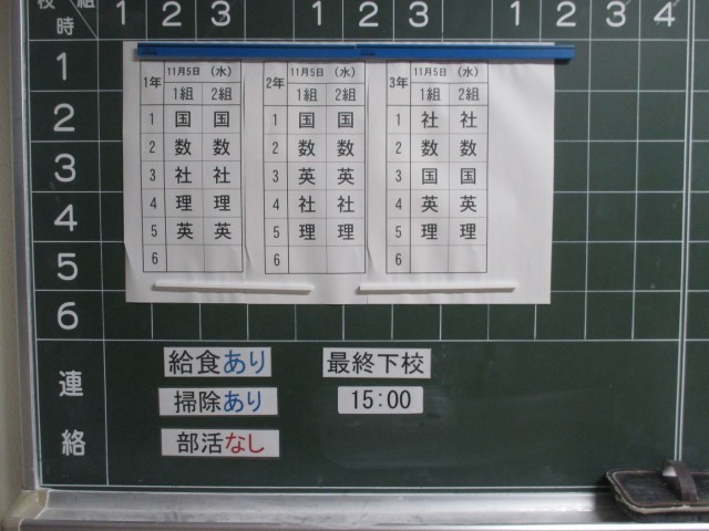 11月5日(水)の時程は50分の5校時、給食あり、掃除なし、14:40帰りの会終了、部活なし15:00下校完了となっています。