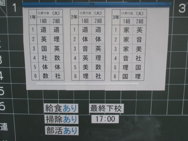 11月11日(火)の時程は50分の6校時、給食あり、掃除あり、15:55帰りの会終了、部活動後17:00下校完了となっています。