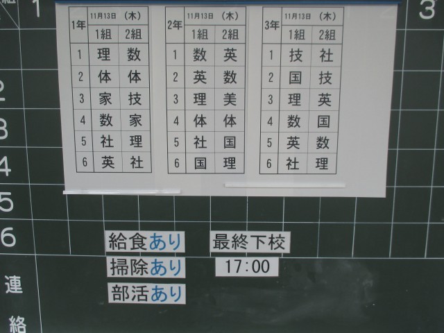 11月13日(木)の時程は 50分の6校時、給食あり、掃除あり、15:55帰りの会終了、部活動後17:00下校完了となっています。