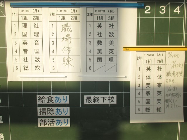 11月17日(月)の時程は50分の6校時、給食あり、掃除あり、15:55帰りの会終了、部活動後17:00下校完了となっています。