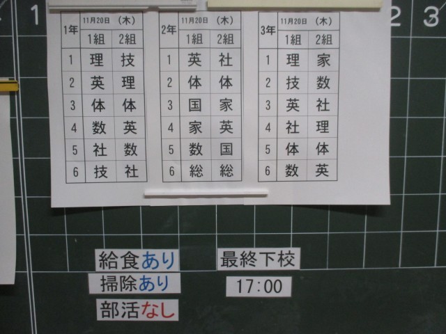 11月20日(木)の時程は、50分の6校時、給食あり、掃除あり、放課後学習あり、16:10帰りの会終了、質問教室後17:00下校完了となっています。