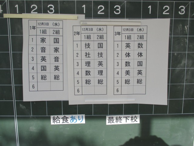 12月3日(水)の時程は 50分の5校時、給食あり、掃除なし、14:40帰りの会終了、部活なし15:00下校完了となっています。