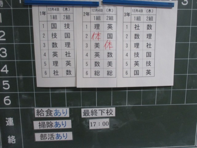 12月4日(木)の時程は 50分の6校時、給食あり、掃除あり、15:55帰りの会終了、部活動後17:00下校完了となっています。