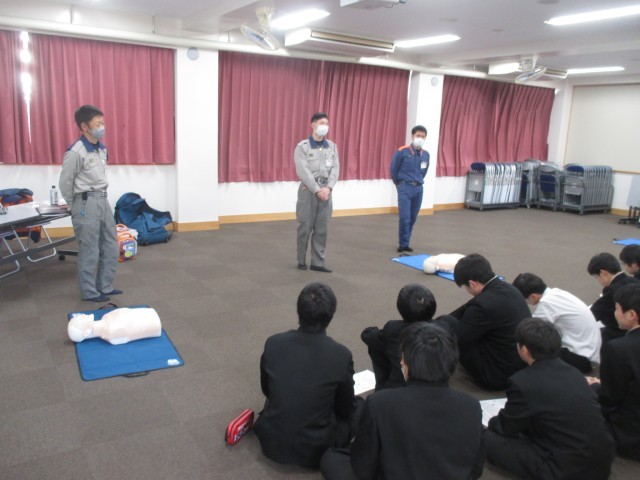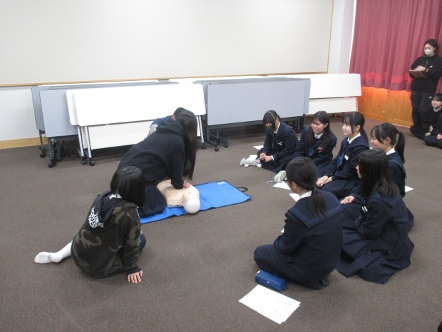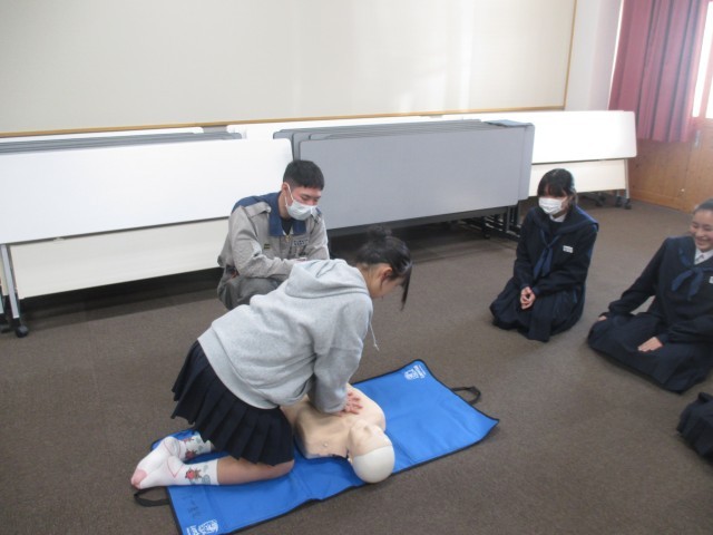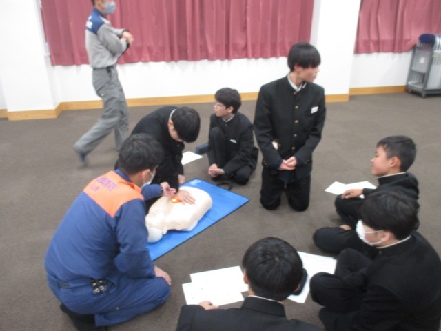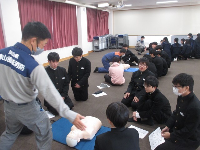 本日は、津山消防署から講師をお迎えし、心肺蘇生法について学びました。先日の職場体験での経験を生かし、見本になってくれる生徒もいました。全員が何かしらの行動で有事に際してできる行動を学び、いざというときの備えになったと思います。