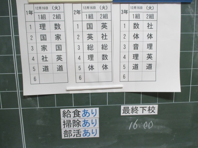 12月16日(火)の時程について 50分の5校時、給食あり、掃除あり、14:55帰りの会、部活動後16:00下校完了となっています。