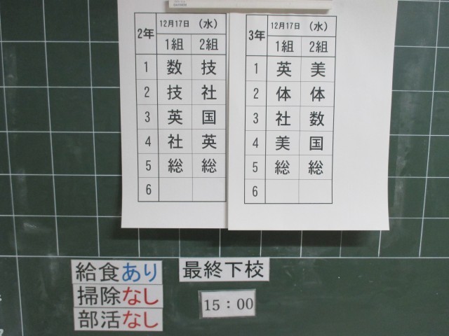 12月17日(水)の時程は 50分の5校時、給食あり、掃除なし、14:40帰りの会終了、部活なしで15:00下校完了となっています。