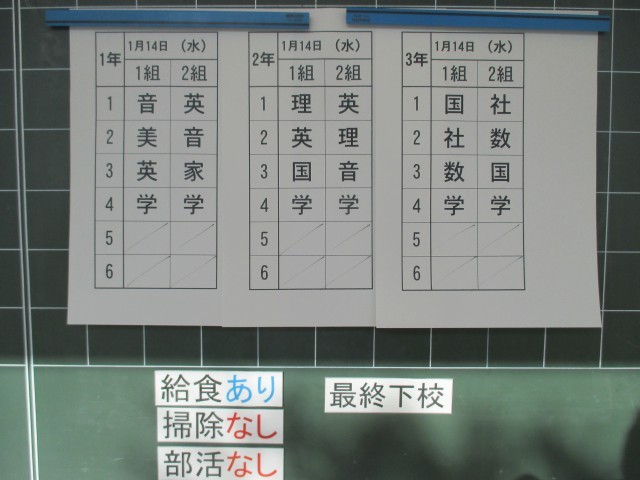 1月14日(水)の時程は、45分の4校時、給食あり、掃除なし、13:00に帰りの会が終了し、13:10下校完了となっています。(部活動はありません)