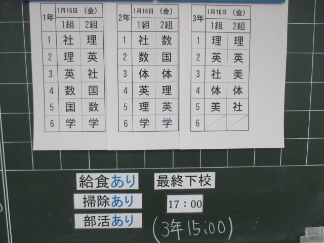 1月16日(金)の時程は、1,2年生が50分の6校時、給食あり、掃除あり、15:55に帰りの会が終了し、部活動後17:00下校完了となっています。