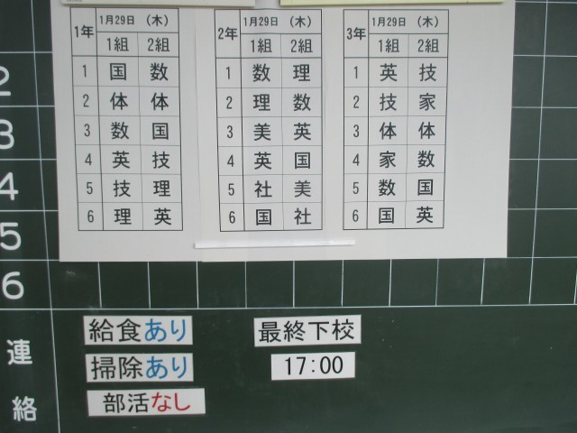 1月29日(木)の時程は 50分の6校時、給食あり、掃除あり、15:55帰りの会終了、部活なし(わくわくクッキングがあります!)で17:00下校完了です。