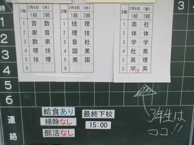 2月4日(水)の時程は 50分の5校時、給食あり、掃除なし、14:40に帰りの会が終了し、15:00下校完了となっています。3年生は4日・5日は県立高校の特別入試の日です!(受検しない人は家庭学習日)そのための入試事前指導がありました。その様子と朝の生徒会専門委員会の放送の様子を載せておきます。(どの委員会からも言葉遣いについての取り組みが紹介されてましたね。)