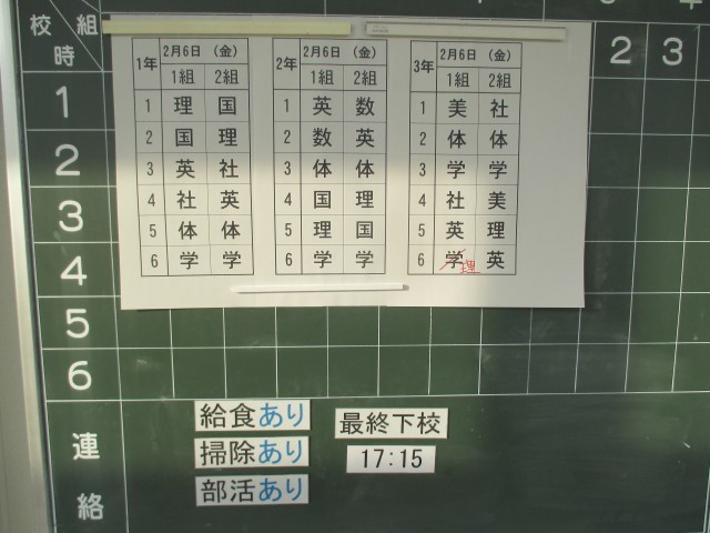 2月6日(金)の時程は 50分の6校時、給食あり、掃除あり、15:55帰りの会終了、部活動後17:15下校完了となっています。