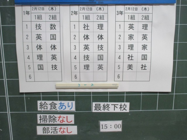 2月12日(木)の時程は 50分の5校時、給食あり、掃除なし、14:40帰りの会が終了し、15:00下校完了となっています。