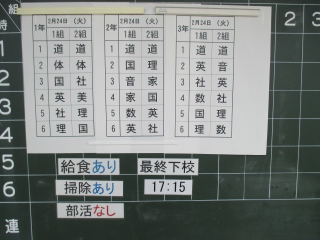2月25日(水)の時程は 50分の5校時、給食あり、掃除なし、放課後学習あり、14:55に帰りの会が終了し、15:15下校完了となっています。