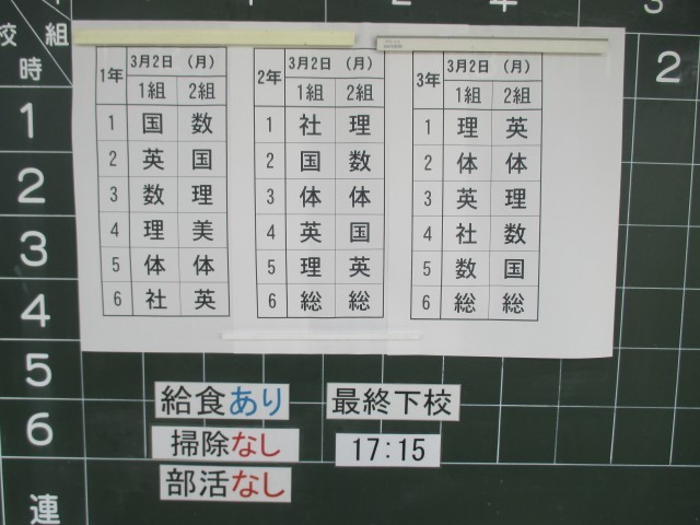 3月2日(月)の時程は 45分の6校時、給食あり、掃除なし、15:10帰りの会終了、専門委員会後16:45下校完了となっています。