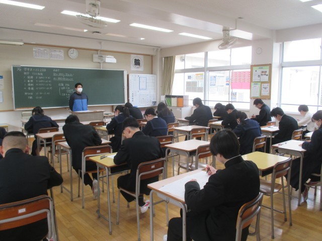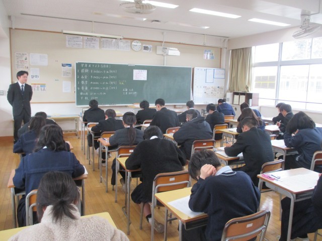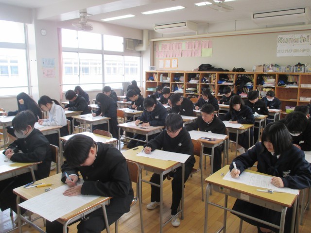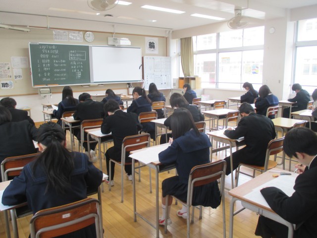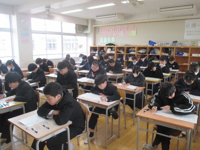 本日は1,2年生の学年末テスト2日目(3年生は直前テスト)でした。今回のテストは1年間の学習の集大成となるテストです。きっと、みんな気合いを入れて準備してきたことと思います。1,2年生の様子を載せていますが、1年生もきちんと集中してテストを受けられるようになっています。受け方だけを見ても、1年間の成長が感じられます。来年度のさらなる成長が楽しみですね。