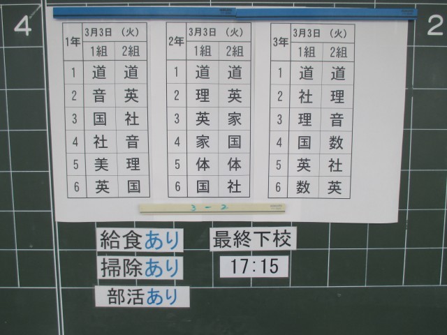 3月3日(火)の時程は50分の6校時、給食あり、掃除あり、15:55に帰りの会が終了し、17:30下校完了となっています。