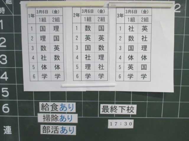 3月6日(金)の時程は 50分の6校時、給食あり、掃除あり、15:55に帰りの会が終了し、部活動後17:30下校完了となっています。