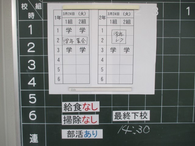 3月24日(火)の時程は 50分の3校時、給食なし、掃除なし、11:55に帰りの会が終了し、部活動後14:30下校完了となっています。