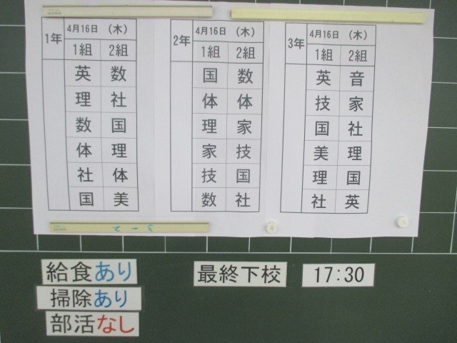 4月16日(木)の時程は 50分の6校時、給食あり、掃除あり、15:55に帰りの会が終了し、専門委員会後17:30に下校完了となっています。