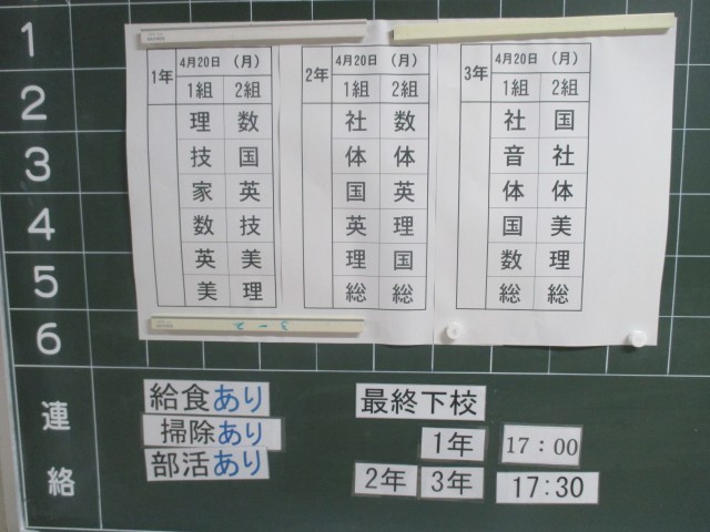 4月20日(月)の時程は 50分の6校時、給食あり、掃除あり、15:55帰りの会終了、部活動後1年生は17:00下校完了、2,3年生は17:30下校完了となっています。