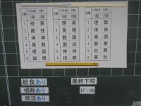 45分×6校時、給食あり、掃除なし、部活動なし、帰りの会終了15:10、生徒下校完了16:45です。※写真は17:00になっていますが16:45です。