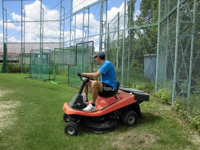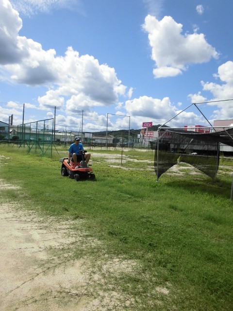 秋空の美しい9月19日、翌日のPTA奉仕作業に先駆けて、PTA学級部の津田さんがグラウンドの草を刈ってくださっています。