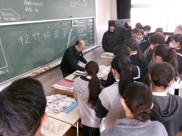 2年生が特別非常勤講師の青山利通先生に水墨画を教わっています。